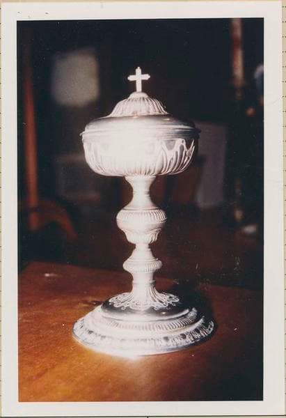 h = 27 (Dimensions du ciboire) ; Dimensions de la coupe : d = 12,2. Dimensions du pied : d = 15