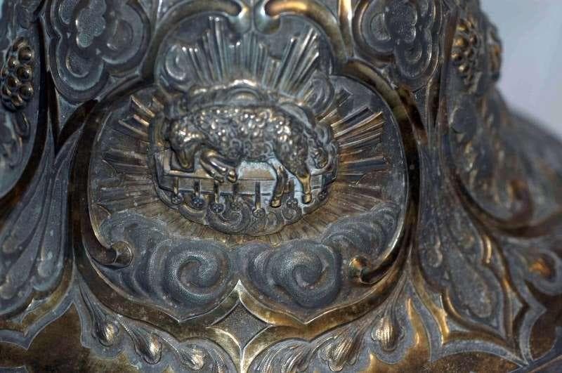 agneau mystique, rayons lumineux, nuée, Christ en croix, serpent : globe, blé, vigne, ornementation
