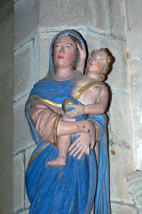 L'Enfant est tenu par la Vierge sur le bras gauche, maintenu par le bras droit. Il lève le bras droit et tient de la main la chevelure de sa mère. De sa main gauche, il tient le globe du monde. Vierge aux pieds nus.