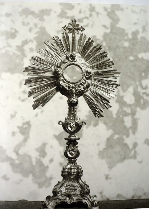 Quatre pieds volutes, dessus du pied et tige composée de volutes, nuée à chérubins, croix et rayons.