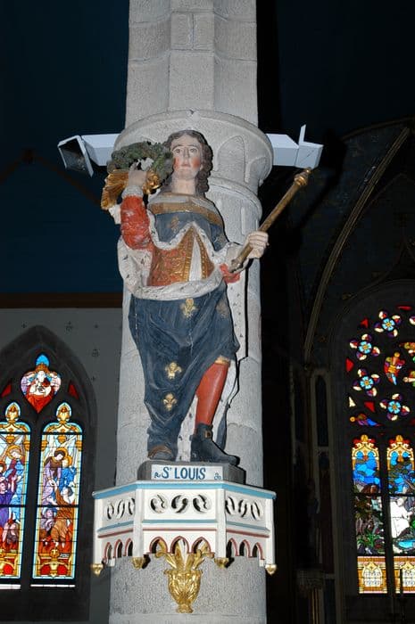 Saint Louis vêtu d'un costume XVIIe siècle et de longs cheveux blouclés, tient la couronne d'épines de la main gauche.