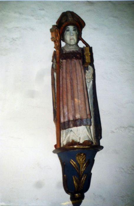 La mitre à orfrois, le fermoir de la chape, la crosse, l'absence de bras (seules les mains tiennent le livre et la crosse) en font une belle pièce fort ancienne.