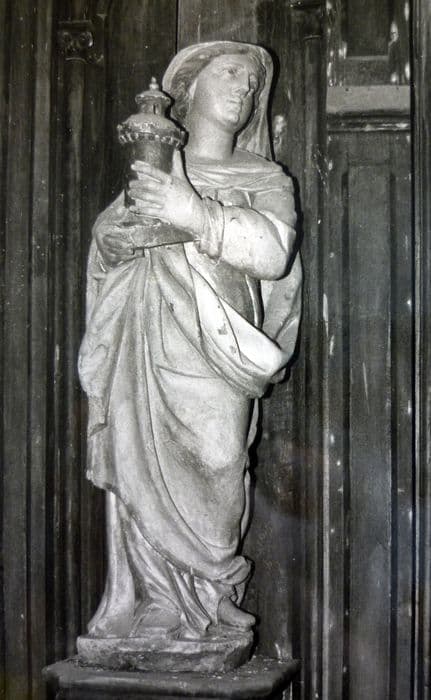Sainte Barbe porte des deux mains la boîte à onguent.