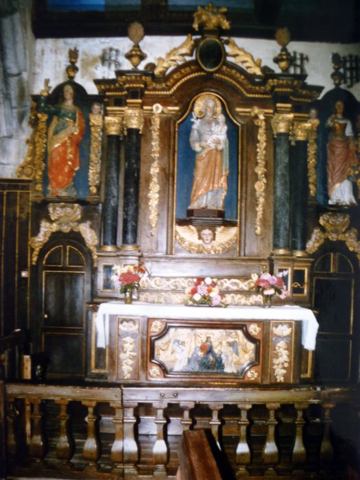 Statue de saint Joseph au centre en plâtre polychrome ; statue de saint Jean (?) à gauche en bois polychrome ; statue de sainte Barbe (?) à droite en bois polychrome.