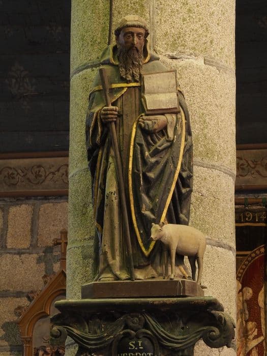 saint Herbot ; en pied ; portant ; livre ; bâton ; veau