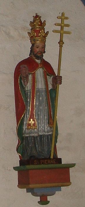 Saint Pierre en pied, porte la tiare et la croix papale.