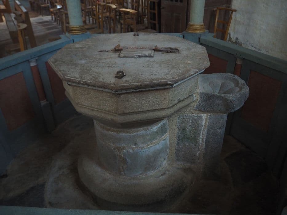 Dans la chapelle des fonts baptismaux de l'église (cuve). Dans le bas-côté nord, angle nord-ouest, de l'église (fonts baptismaux).
