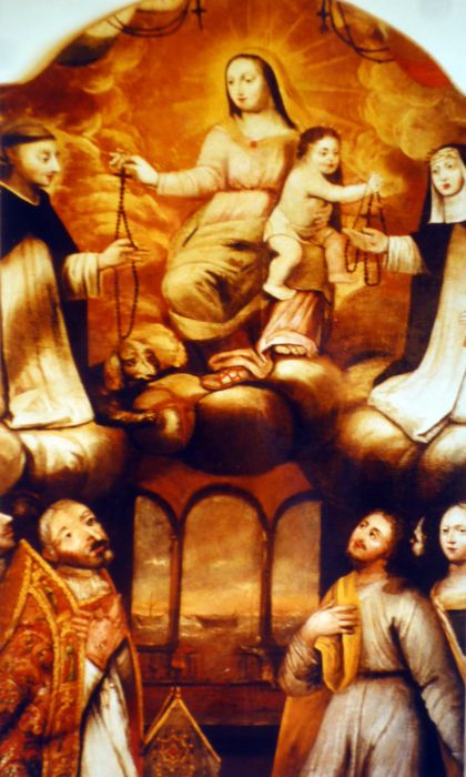 Vierge à l'Enfant ; nuée ; don ; rosaire ; sainte Catherine de Sienne ; saint Dominique de Guzman ; agenouillé ; ange ; chien ; globe ; évêque ; homme ; femme ; fond de paysage ; vue d'architecture ; mer ; bateau