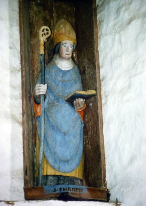 Saint Philibert en habit d'évêque porte le livre de la main gauche et tient la crosse de la main droite.