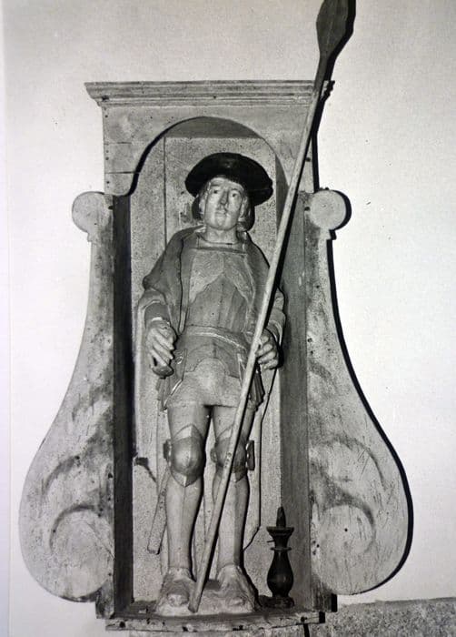 Couffon parle de saint avec une lance en costume Louis XII. Le saint, en cuirasse et manteau, est coiffé d'une sorte de béret et tient de la main gauche une longue lance et à la main droite un objet qui pourrait être une poignée d'épée.