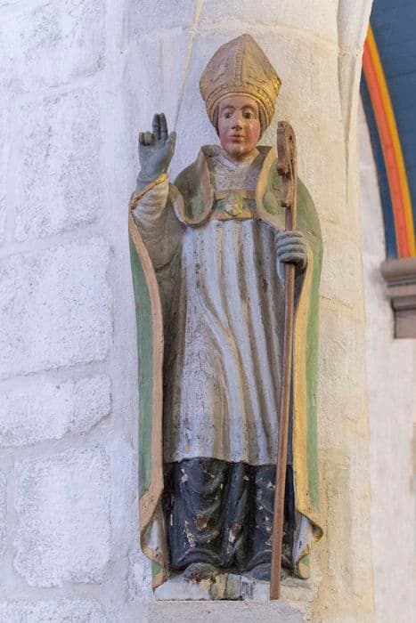 Saint Maudez en tenue d'évêque bénit de la main droite et tient la crosse de la main gauche.