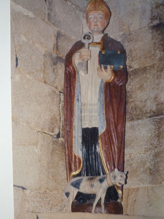 saint Tugen ; évêque ; en pied ; portant ; bâton ; livre ; clé ; chien