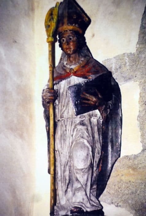 Saint Evêque tenant la crosse de la main gauche et le livre ouvert de la main droite qu'il est en train de lire.