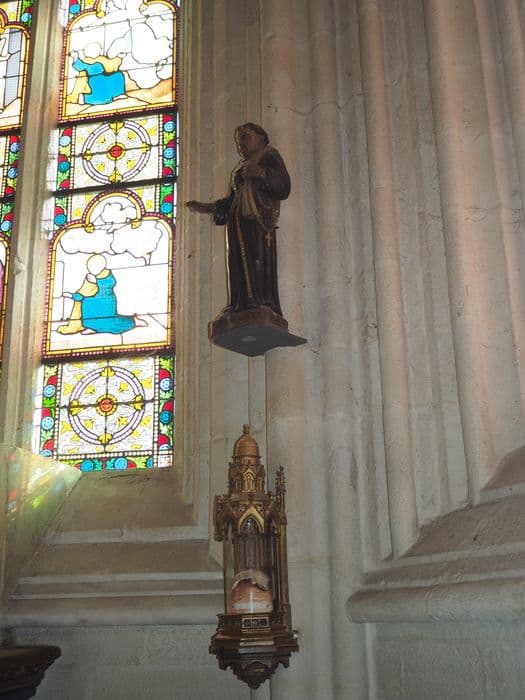 La statue est en bois et le reliquaire se situant dessous est en laiton. Ce dernier contient une relique.