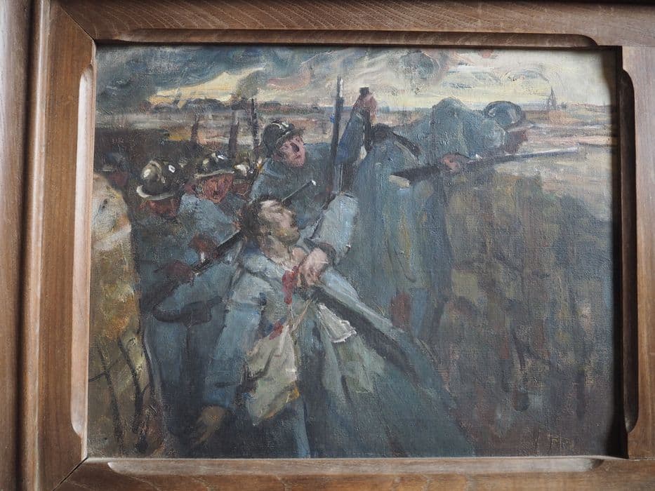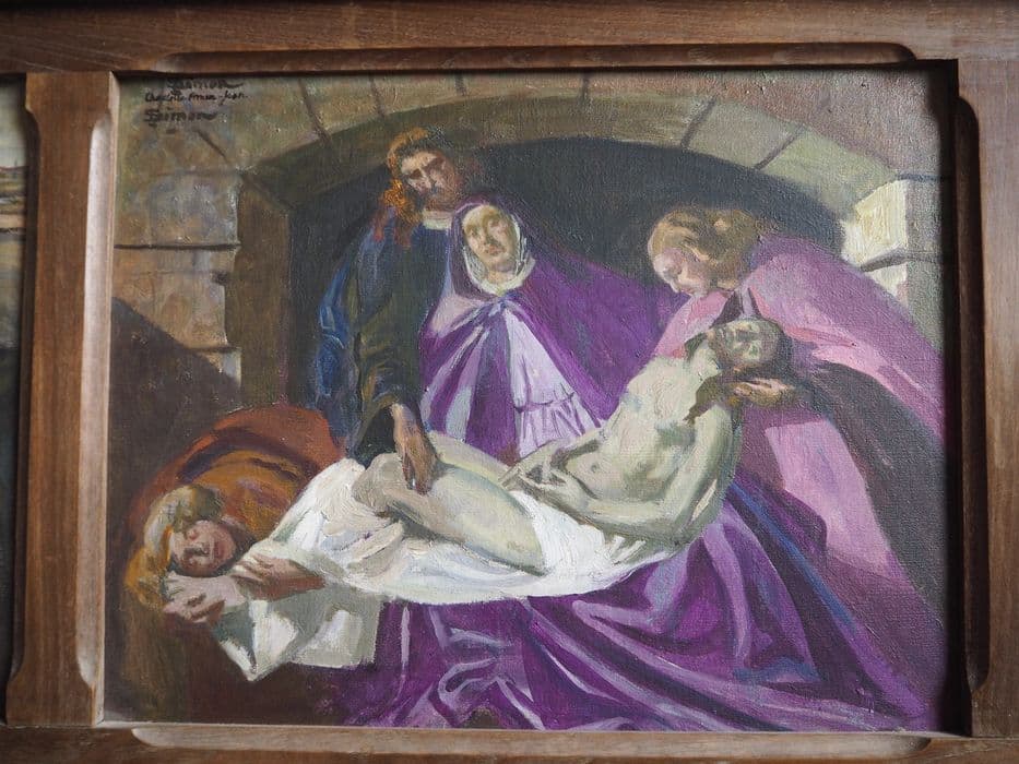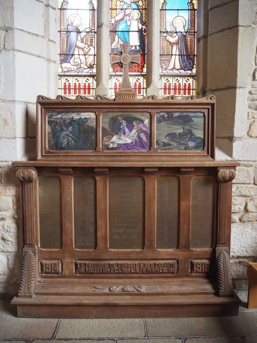 Le mémorial de la Guerre 1914-1918, situé dans l'église Saint-Tugdual, honore le lourd tribut payé par la commune de Combrit qui, au sortir de la Grande Guerre, comptabilise 140 morts sur le front. Quant aux blessés, ils seront recueillis dans la villa de l'amiral de Penfentenyo à Sainte-Marie, hameau dépendant de la commune de Combrit. Le monument aux morts est commandé par le chanoine Pedel, alors recteur de la commune, comme l'atteste la lettre de 1923 envoyée au peintre Lucien Simon, déjà connu pour ses nombreuses uvres liées à la Grande Guerre. Cette même lettre fait mention de M. Boucher, ébéniste-sculpteur à Scaër, tandis que le nom du graveur Mialin de Quimper est révélé par l'inscription sur le monument, décoré de trois petites toiles signées de Lucien Simon et de sa fille Charlotte Aman-Jean. Le peintre Lucien Simon (1861-1945), d'origine parisienne, s'est consacré au portrait mais surtout à la peinture de scènes de la vie quotidienne et de la Bretagne en particulier. Selon le Bénézit, son dessin est très vigoureux, sa palette très chaude et colorée ; ces caractéristiques sont bien reconnaissables sur les petites toiles du monument aux morts. Elève au lycée Louis-le-Grand de Paris, Lucien Simon tout en peignant et dessinant, se destine à l'Ecole polytechnique. Au cours de son service militaire, il se lie d'amitié avec le peintre Georges Desvallières et suit, de 1880 à 1883, les cours de Tony Robert-Fleury et de William Bouguereau à l'Académie Jullian. Il expose au salon, où il acquiert une bonne réputation auprès de la société parisienne qu'il portraiture. Il épouse en 1891 la peintre Jeanne Dauchez, sur du peintre breton André Dauchez. Ils auront quatre enfants, dont Charlotte, qui épousera François, fils du peintre Edmond Aman-Jean. Grâce à son épouse, il découvre la Bretagne et achète un sémaphore désaffecté à Sainte-Marine, qui deviendra sa résidence secondaire et son atelier de peinture, où il peint de nombreuses scènes intimistes et familiales. Obtenant la médaille d'or à l'exposition universelle de Paris de 1900, sa réputation ne cessera de croître, tant en France qu'à l'étranger, jusque dans les années 1920. Suite à sa rencontre avec Charles Cottet, il fréquente les artistes de la Bande Noire : Emile-René Ménard, André Dauchez, René-Xavier Printet, qui prend le contre-pied de la peinture claire des impressionnistes. En 1917, il est envoyé au front pour dessiner des scènes sur le vif. En 1923, il est nommé professeur à l'Ecole des Beaux-Arts de Paris, puis est élu à l'Académie en 1927 et enfin nommé peintre officiel de la marine en 1933. L'Etat lui commande plusieurs oeuvres dont la Messe du Soldat et Le Sacrifice, martyre des soldats et des morts accueillis au Paradis par le Christ, pour l'église Notre-Dame-du-Travail à Paris, puis les décors de l'escalier du palais du Luxembourg, inaugurés en 1929, et composés de quatre toiles de grand format marouflées, qui s'associent au plafond peint par Maurice Denis. Il réalise plus tard trois toiles, pour l'abri du Marin au Guilvinec (toutes classées au titre des monuments historiques) et meurt en 1945 à Sainte-Marine. Il est enterré au cimetière de Combrit. Ce monument aux morts est en soi une uvre originale, de belle facture, dans un style bien représentatif de son époque, où les artistes utilisent un vocabulaire décoratif aux lignes épurées, comme les vagues sculptées sur la partie haute. Le décor végétal très stylisé du sommet des pilastres et la graphie utilisée sont caractéristiques des années 1920-1930. Les trois petites peintures de Lucien Simon, conformes au souhait du chanoine, constituent un témoignage très important pour l'époque et s'inscrivent dans le corpus de la Première Guerre mondiale, qu'il a vécu de l'intérieur, et par la participation de son fils, qui est fait prisonnier et reste en Allemagne jusqu'en 1918.
