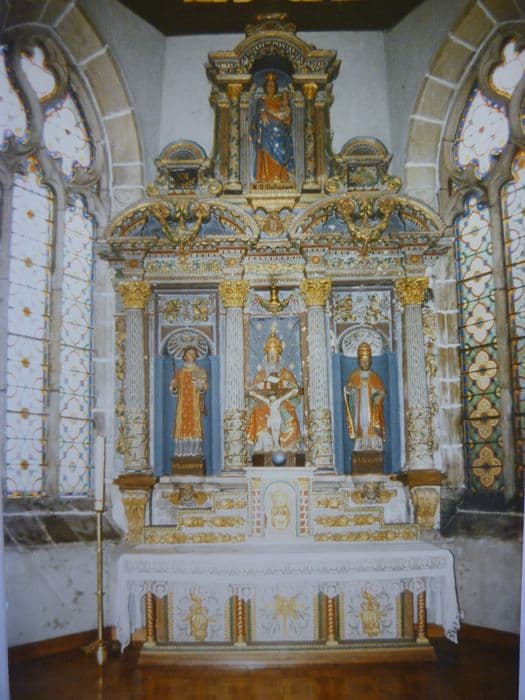 maître-autel de la sainte Trinité ; statue : Vierge à l'Enfant dite Notre Dame du Folgoët ; 3 statues : Saint Laurent, Sainte Trinité, Saint Sixte