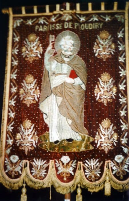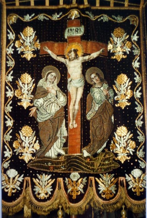 bannière : Christ en croix entre la Vierge et saint Jean, Saint Pierre