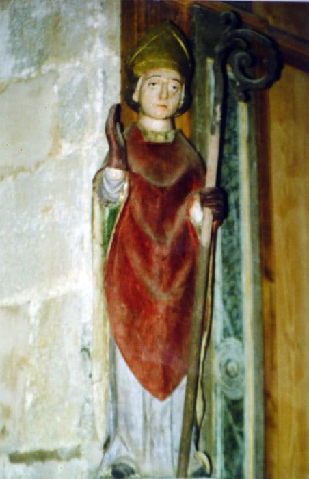 saint identifié ; évêque ; bénédiction ; portant ; crosse