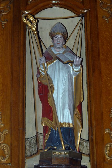 Saint Onneau en habit d'évêque tient la crosse de la main gauche et le livre ouvert de l'autre main.