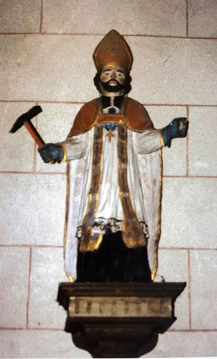 Saint Eloi en habit d'évêque tient le marteau de la main droite.