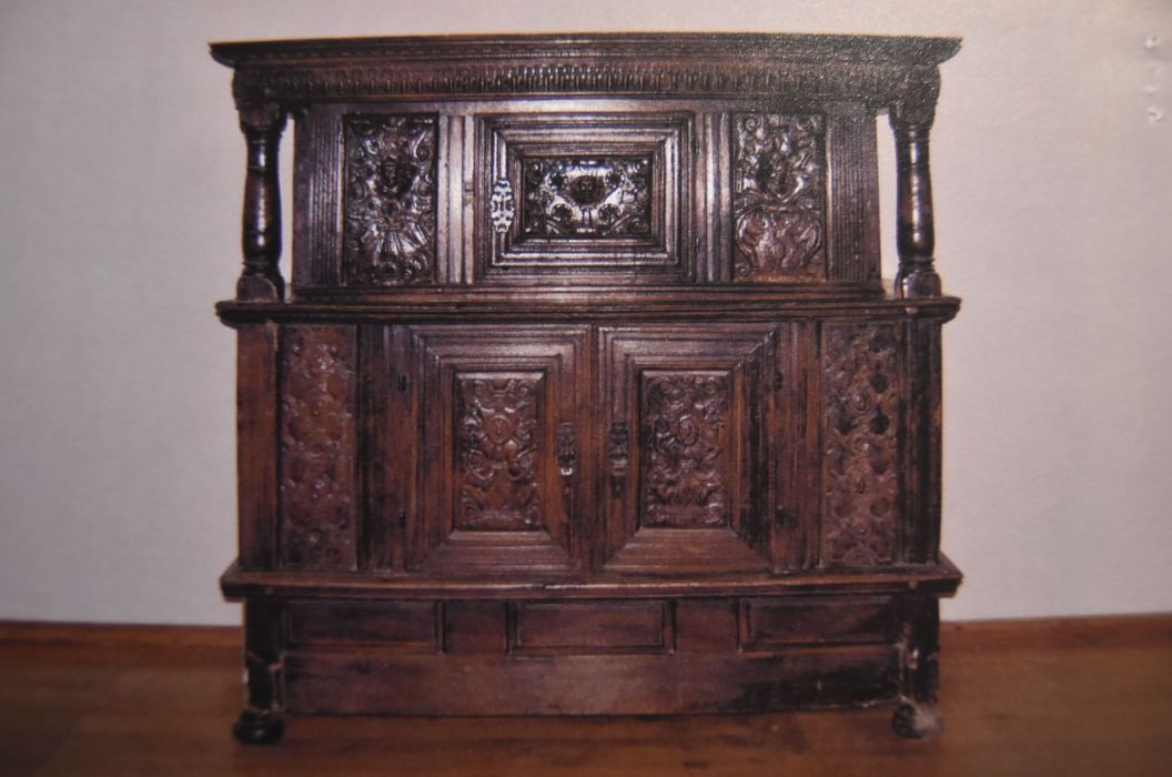 Partie inférieure à trois panneaux à table saillante à plante-bande, montants intermédiaires à bords moulurés. Partie médiane à deux battants à un panneau à petit cadre et table saillante, encadrés de deux panneaux à table saillante séparés des battants par un montant intermédiaire. Partie supérieure à un battant central à un panneau à petit cadre et table saillante, encadré de panneaux à table saillante.