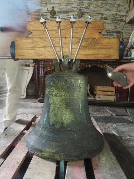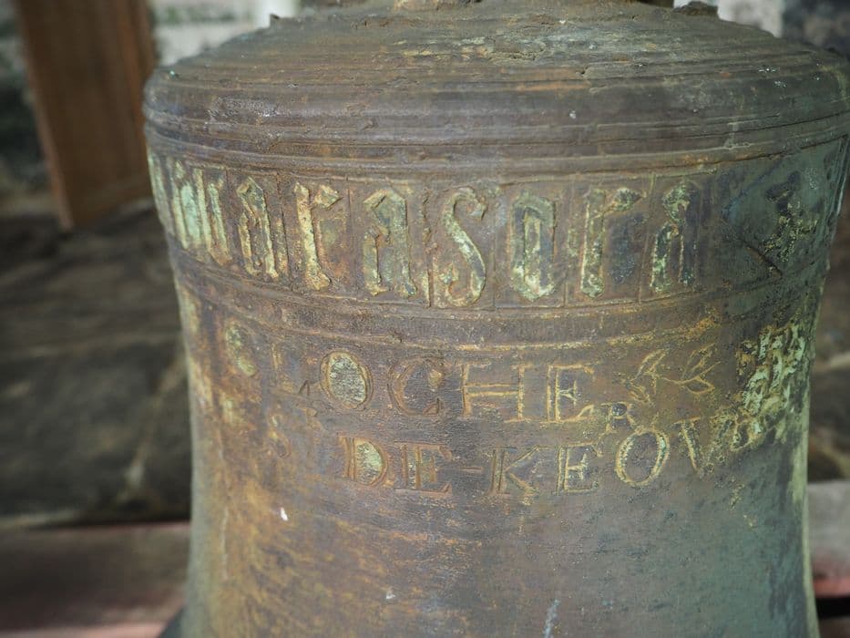 Deux lignes d’inscription, la plus ancienne en gothique sur le registre supérieur, la seconde gravée sur le ventre de la cloche avec les armes des propriétaires du XVIIIe siècle.