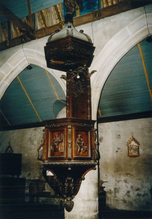 Chaire à prêcher, sa cuve ornée de bas-reliefs représentant les Évangélistes et son dôme supportant une statue d’ange.