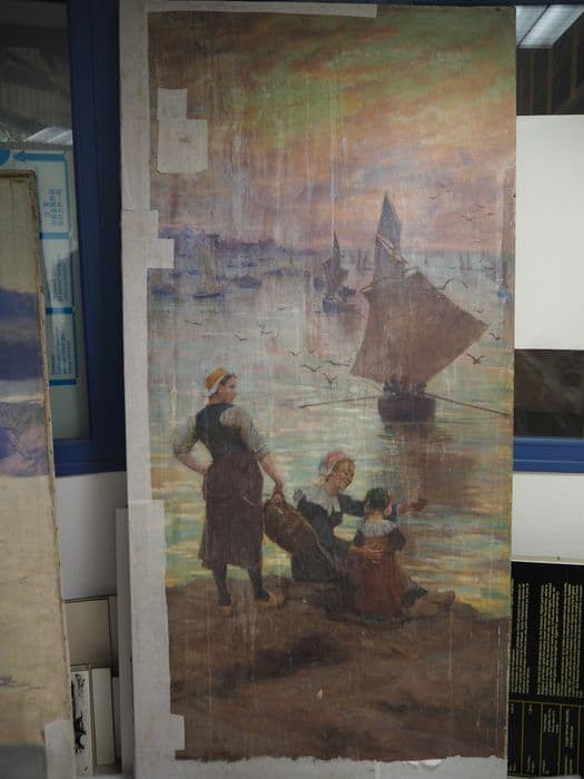 tableau : Deux femmes et un enfant attendant le retour de la pêche