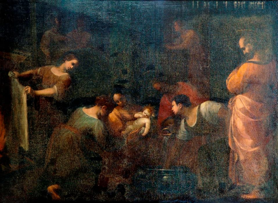 saint Jean-Baptiste au centre avec sainte Elisabeth. quatre femmes s'affairent autour d'eux. à droite, probablement Zacharie