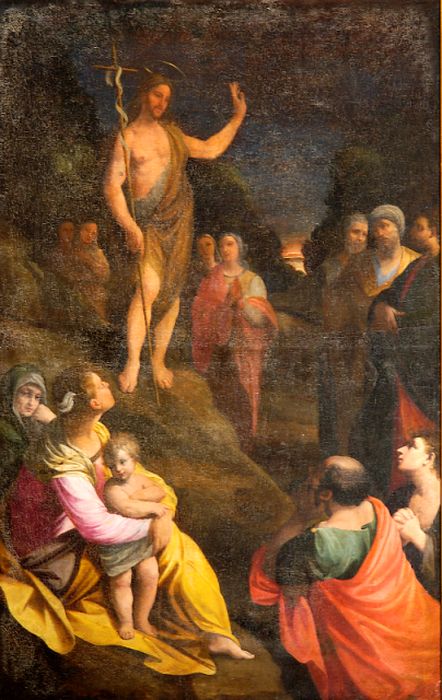 Saint Jean-Baptiste, représenté dans la partie supérieure, vers la gauche du tableau, lève le bras gauche vers des personnages qui l'entourent. au premier plan, à droite de saint Jean-Baptiste, deux femmes sont assises, dont l'une tient un enfant. à droite du tableau, un personnage étendu vu de dos et une femme dans l'attitude de la prière.