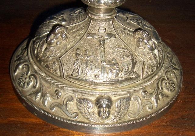 Socle : têtes d'angelots ailées entre des scènes de la vie du Christ. pied : médaillon avec représentation de la Vierge. Timbale : trois médaillons perlés avec représentation des saints en buste, entre un décor de ceps de vigne.