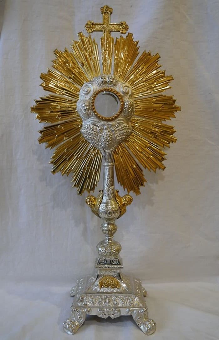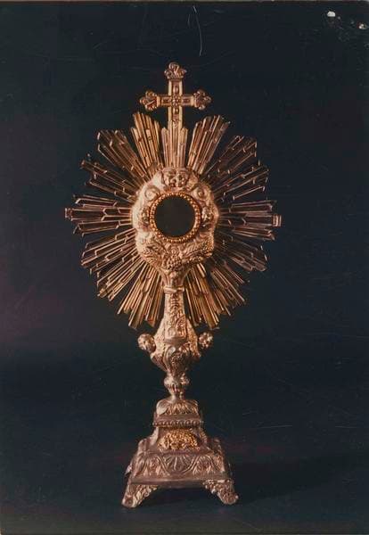 Socle : Agneau mystique. Manche : têtes d'angelots que l'on retrouve dans les nuées autour de la custode perlée.
