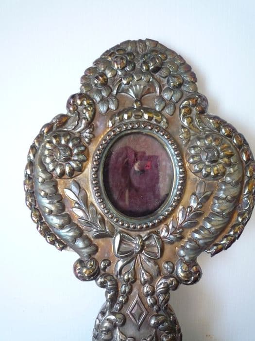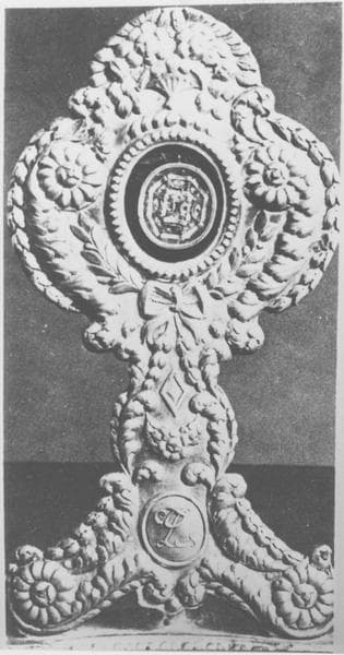 Décor très chargé avec rosace sur le double pied et de chaque côté. Sous la relique un ruban lie deux branches d'olivier.