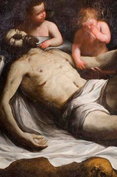 Christ mort ; linceul ; groupe ; angelot ; larmes ; tristesse ; saint Charles Borromée ; vêtement religieux ; cardinal ; baiser ; main