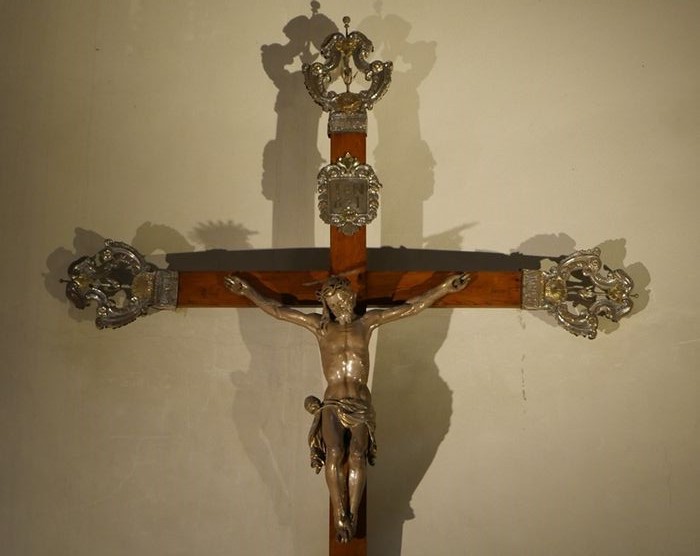 croix de procession portant un Christ en croix et des canti