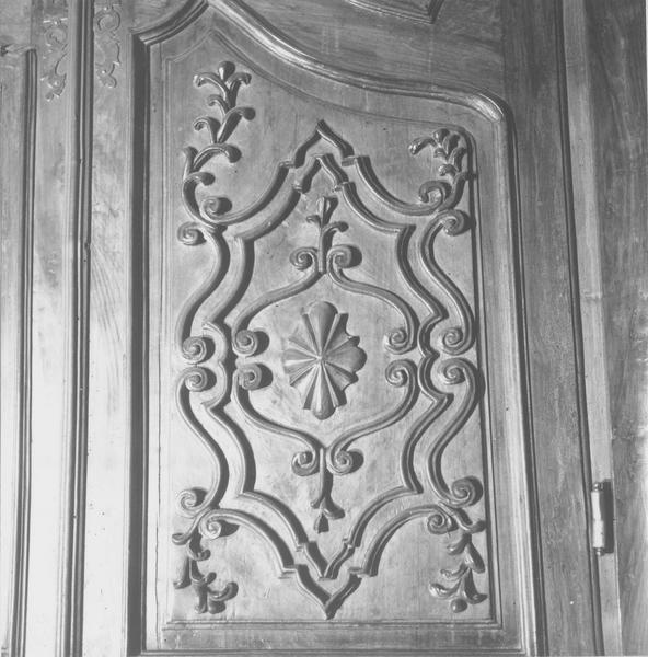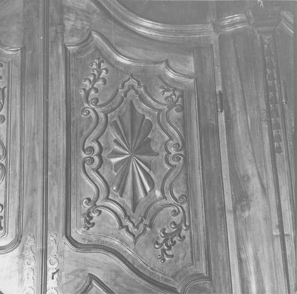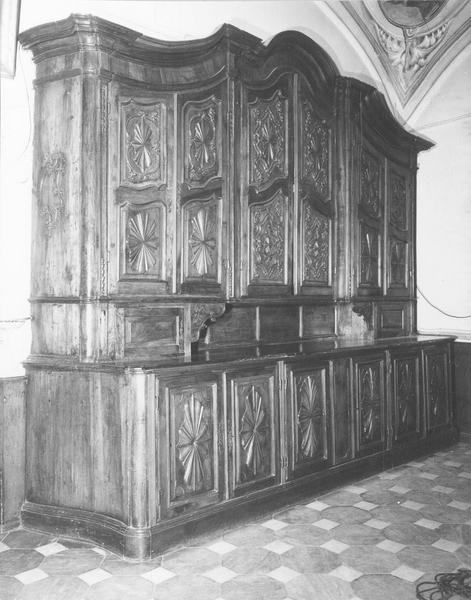 Cette grande armoire de sacristie, de plusieurs mètres de hauteur, d'époque Louis XVI, est en noyer foncé. Ses panneaux sont soit géométriques, avec des rayons de dimensions inégales autour d'un point central, soit ornés de rinceaux stylisés.