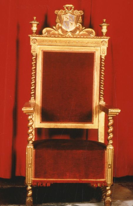 Ce trône épiscopal armoirié est en bois sculpté et doré et velours grenat.