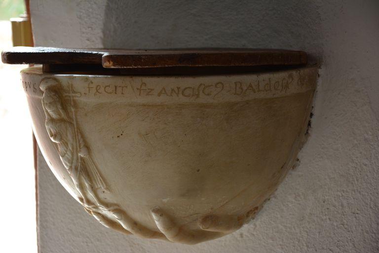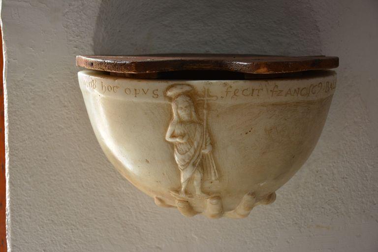 Ce bénitier est orné d'un bas-relief représentant saint Jean-Baptiste.