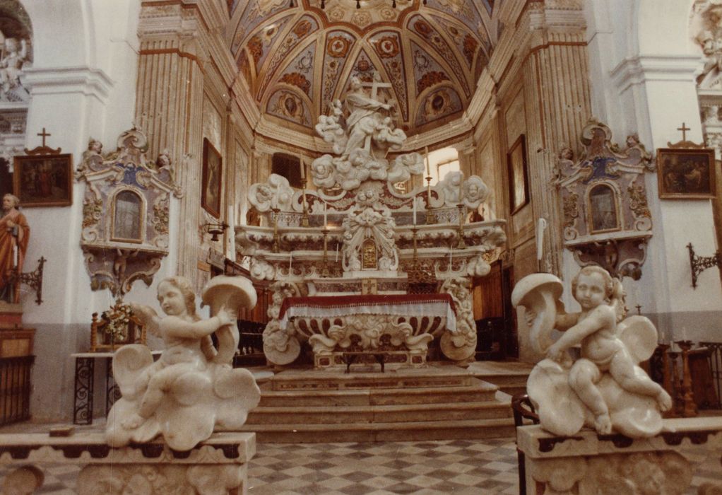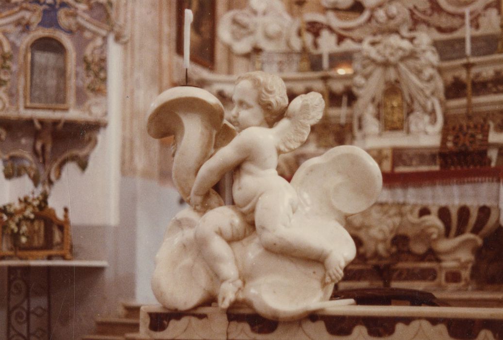 Cette balustrade se compose d'une table reposant sur des piliers ronds, avec applications de grands motifs d'un seul morceau, le tout en marbre blanc et veiné jaune et rouge.