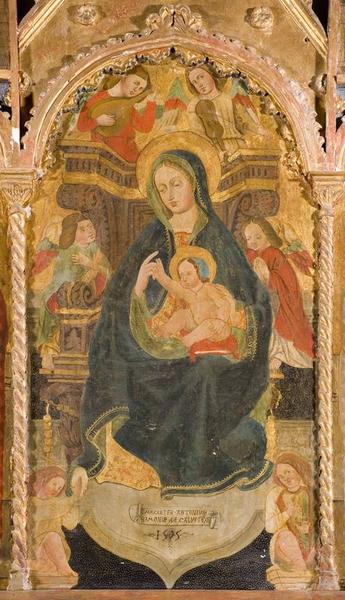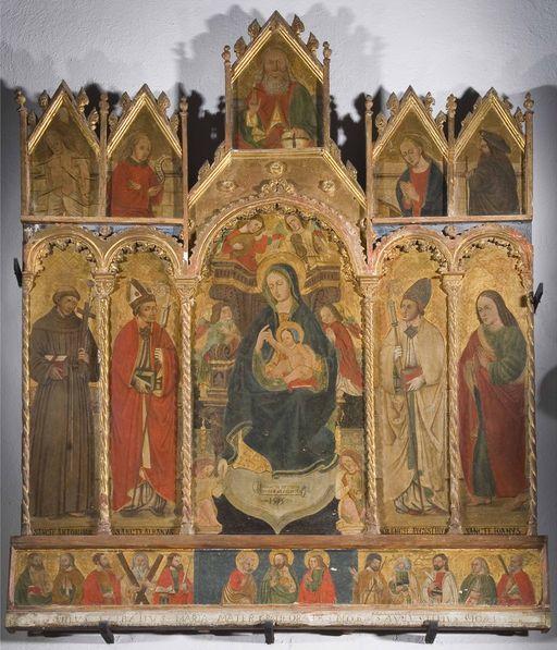 Signature, date : MAGISTER ANTONIUS SIMONIS D CALVI PIXIT 1505 (dans un cartouche). Inscription donnant l'identité du modèle (latin) : S. Antonius, S. Albanus, S. Augustinus, S. Johannes (de gauche à droite, accompagnant les saints debout dans les arcatures). Inscription (latin) : Maria Mater gratiae or apro nobis (séparant les groupes de deux saints).