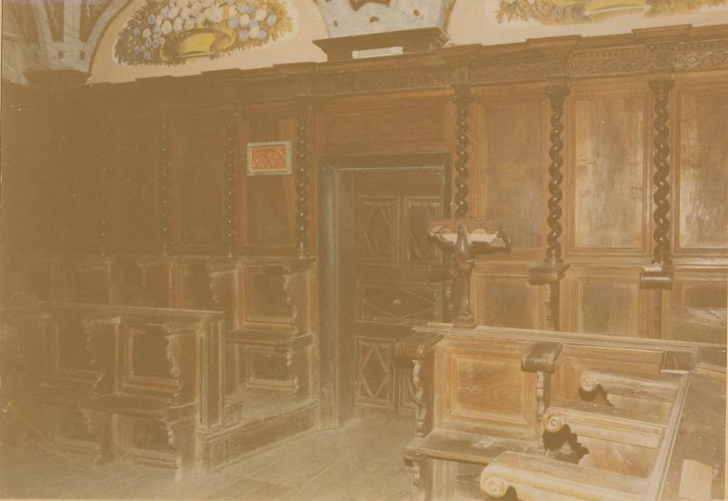 Les panneaux sont séparés par des colonnettes torses. Les banquettes sont agrémentées d'un petit lutrin. A droite, un second devait lui faire face, mais il a disparu.