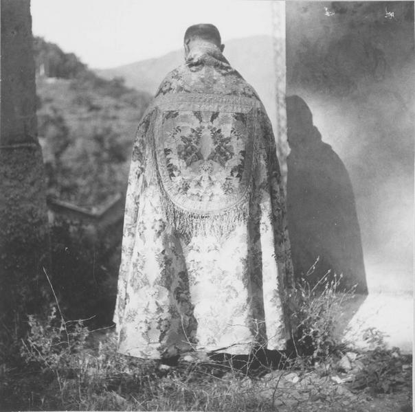 Cette chape est en soie crème et fils d'or. Elle présente un décor de fleurs brodées de couleur (bleu, rose, saumon, mauve), séparées par des feuilles vertes.