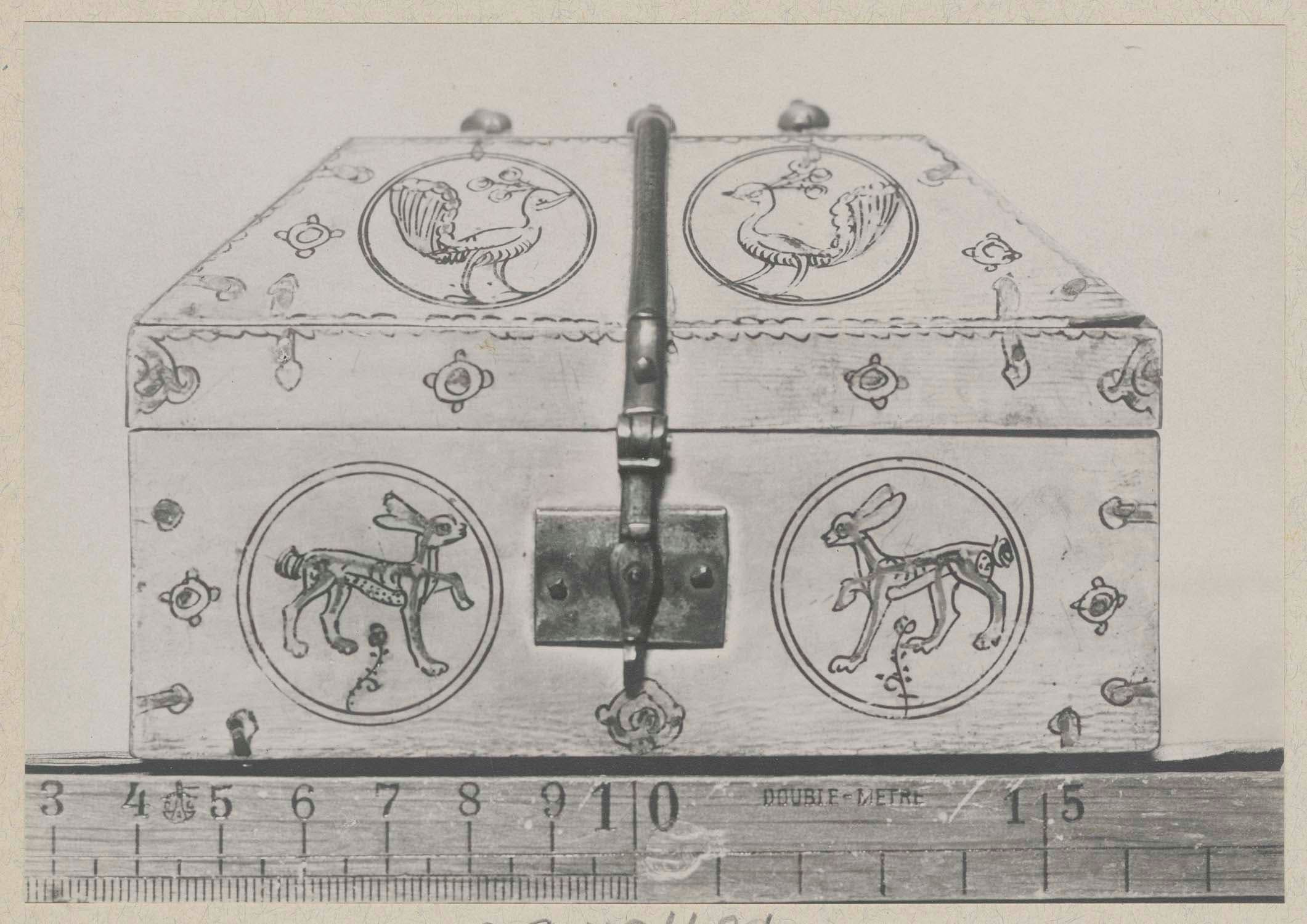 Ce coffret à reliques est de forme rectangulaire. Son couvercle est en forme de pyramide tronquée. Sur le couvercle sont placées trois baguettes en cuivre, dont deux sont articulées en charnières ; la troisième sert à fixer le couvercle sur le devant du coffret, au moyen d'une pointe fixée sur une plaquette en cuivre. Le décor représente des animaux et des fleurs. L'intérieur, garni de parchemin, contient des reliques.