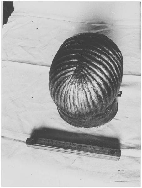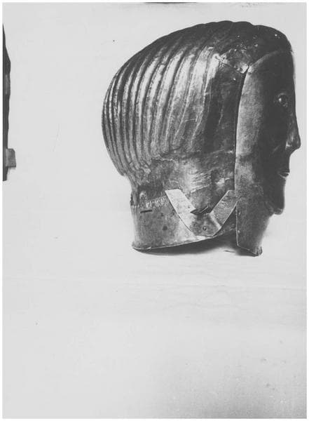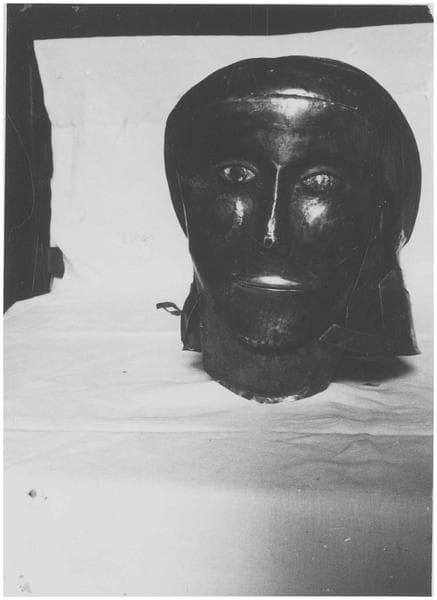 Le crâne présente une réparation ancienne consistant en une pièce de métal mise à l'intérieur. La face est mobile : une sorte de masque s'emboîtant dans le front est fixé à la base par deux charnières en métal. Les yeux, faits d'émail blanc et bleu, sont rapportés et fixéx par deux pointes rivées. Les lèvres sont en cuivre jaune.Le col du vêtement est en forme de dentelures, fait d'une bande de métal rapportée et fixée par des pointes rivées.