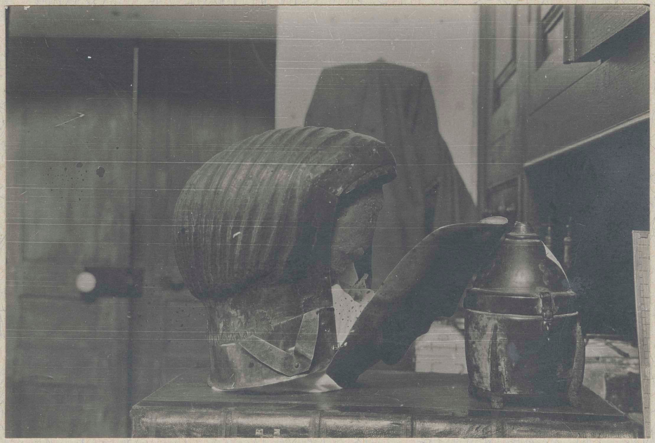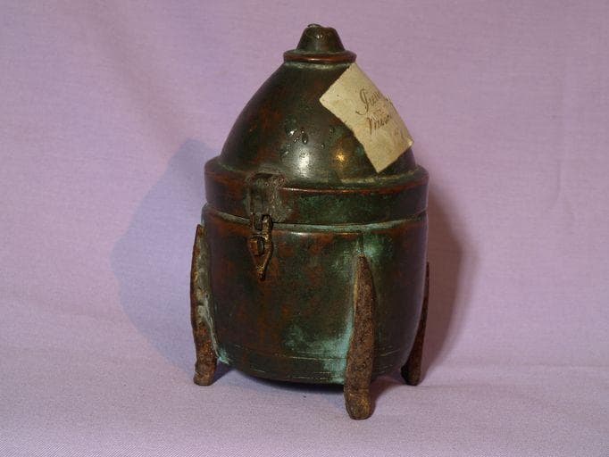 Ce récipient est en forme de poire, reposant sur quatre pieds soudés à l'étain. Le couvercle était primitivement surmonté d'un ornement, qui a disparu (croix ?). Des anneaux servent de charnières, et un anneau permet la fermeture, à l'aide d'un cadenas.