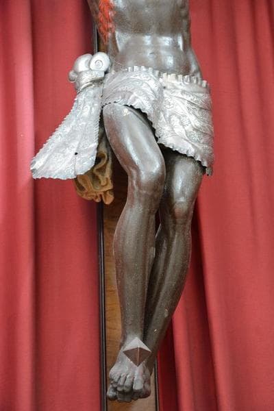 Christ en bois peint en marron foncé, taché de rouge (plaies). Pagne, couronne et parchemin (INRI) sont en feuille d'argent.
