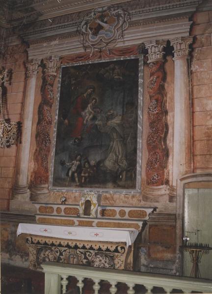 Le retable est un décor peint avec deux colonnes torses encadrées par deux autres colonnes et surmonté du Stemma de saint François.