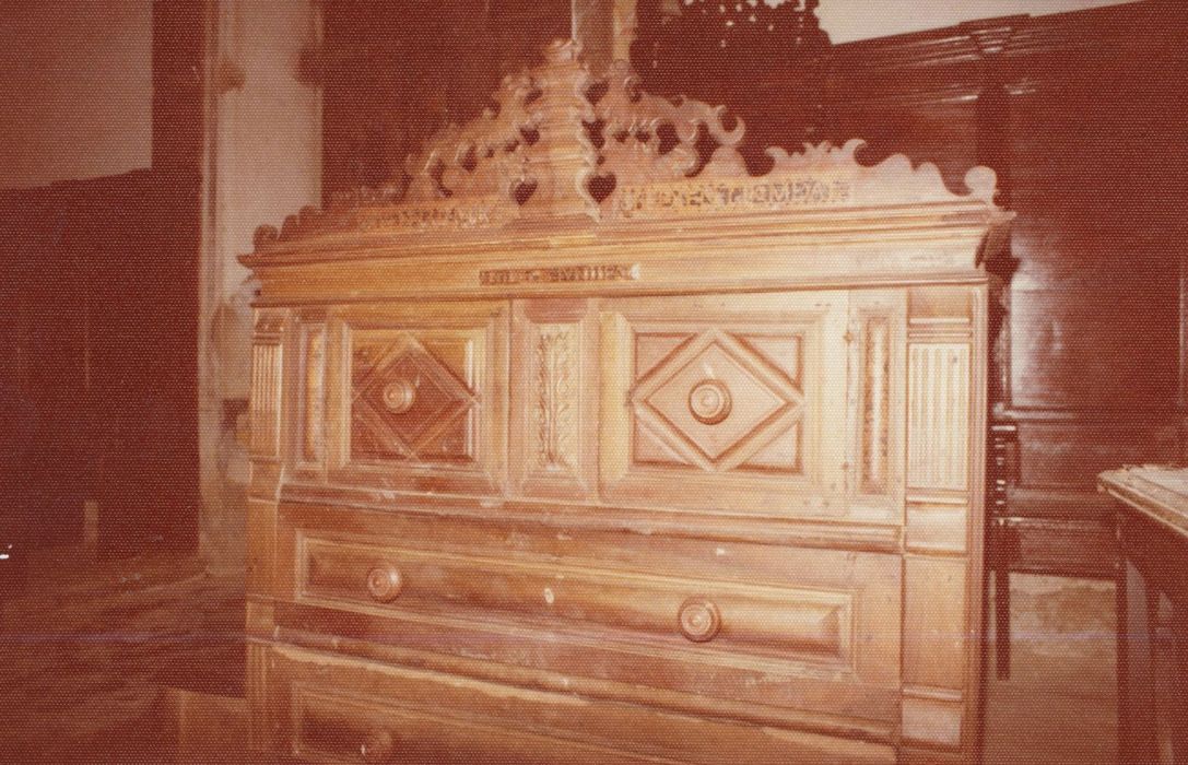 Inscription (en haut de l'armoire) : DIE 28 IUNII FAT. Date (en haut de l'armoire) : 1681. Inscription (2 figurent sur le couronnement) : SILENTIUM ET BEDIENTAMDATE.