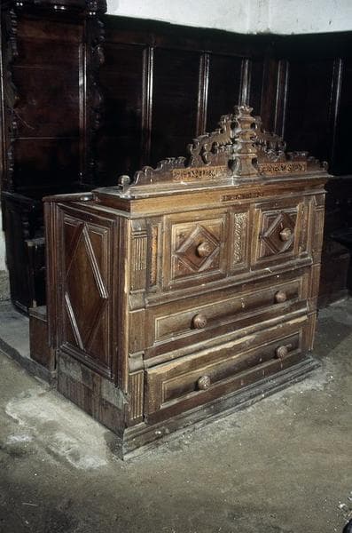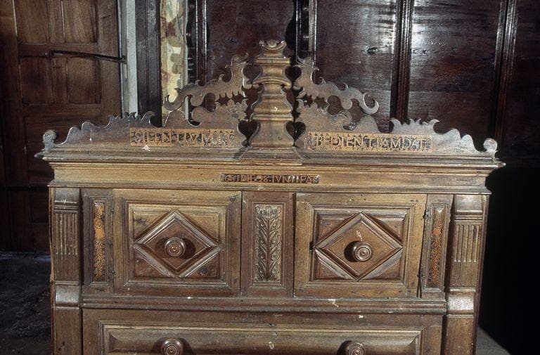 La première armoire se trouve à gauche en entrant. Elle possède en partie deux portes et deux grands tiroirs en partie basse. L'autre armoire est plus simple, elle possède un grand tiroir en partie haute et deux portes en partie basse.