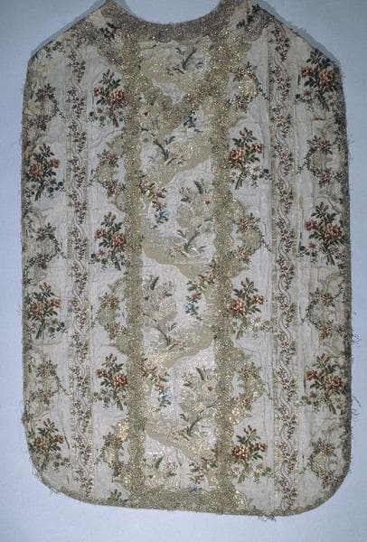 chape, chasuble, 2 dalmatiques, 2 étoles, 3 manipules, bourse de corporal